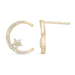 Round Diamonds 10K Yellow Gold Moon and Star Fashion Earrings