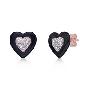 Rose Gold Plated Sterling Silver and Piano Black Ceramic Heart Shaped Stud Earrings with 0.05 Carat