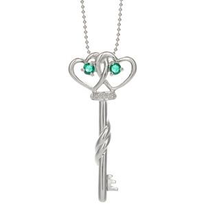Dual Hearts Created Emerald Key Pendant Necklace with Diamonds - Sterling Silver