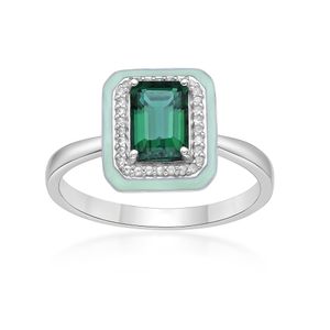 925 Sterling Silver 9x7 Octagon Cut Created Emerald Ring with CWS and Green Enamel Halo