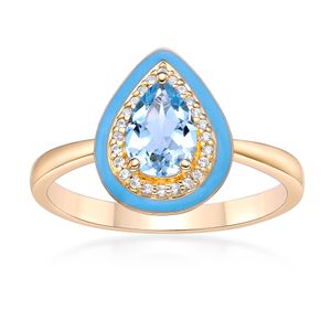 Yellow Gold Plated Sterling Silver 7x5 Pear Shaped Sky Blue Topaz Ring with CWS and Blue Enamel Halo