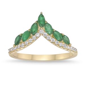 10K Yellow Gold Seven-Stone 4x2 MM Marquise Cut Genuine Emerald Chevron Ring with 0.17 Diamonds Accent