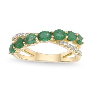 10K Yellow Gold Seven-Stone 4x3MM Oval Cut Genuine Emerald Ring with 0.10 Carat Diamonds Accent
