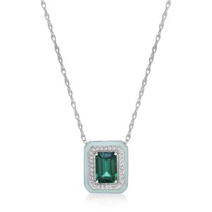 925 Sterling Silver 7x5 Octagon Cut Created Emerald Ring with CWS and Green Enamel - 18" Rope Chain