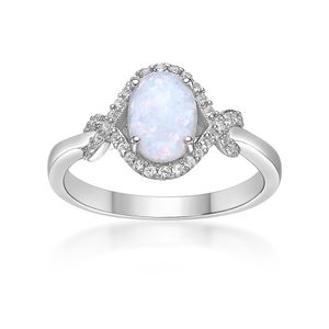 925 Sterling Silver 8x6 Mm Oval Cut Created Opal Ring with Created White Sapphire Halo