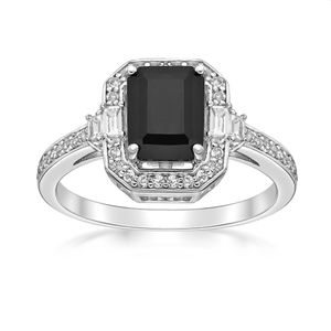 925 Sterling Silver Emerald Cut Black Onyx Ring with White Topaz Accent