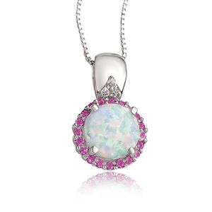 Women's 925 Sterling Silver 8 MM Round CheckboardCreated Opal Pendant Necklace with Created Pink Sapphire Halo - 18 Inch Box Chain