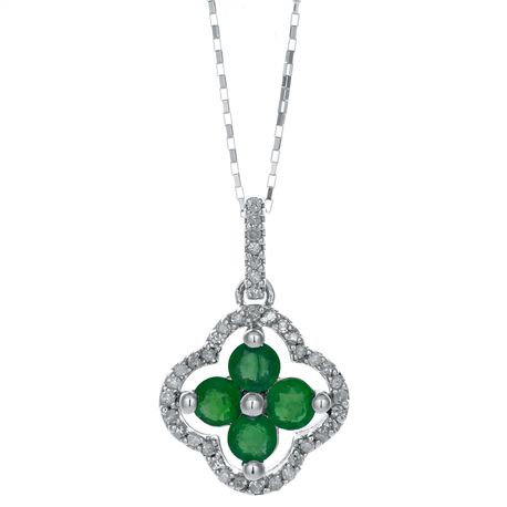 Gemminded 0.12 Carat Diamond and Green Emerald Flower Pendant Necklace in 10k White Gold Spring Ring Box Chain Round Birthstone