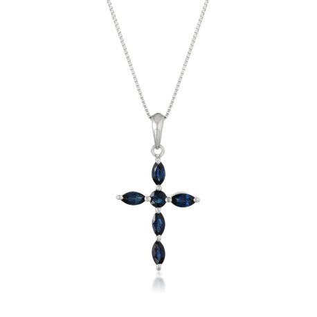 This exquisite women's 10K White Gold Cross Pendant with 4x2 Marquise Cut Genuine Sapphire is a true symbol of faith and beauty. Crafted from high-quality white gold, it shines and sparkles with a radiance that captivates the eye. The marquise cut sapphire adds a touch of elegance and sophistication, while the 18-inch box chain ensures a perfect fit. Whether worn for a special occasion or as a daily reminder of your faith this sapphire cross pendant is the perfect addition to your collection.