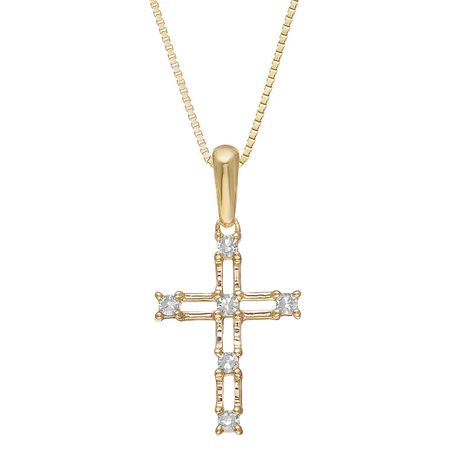 Introducing our 10K Yellow Gold 0.03 cttw Diamond Cross Pendant. Adorned with six sparkling diamonds, this pendant exudes elegance and faith. Crafted with precision, it hangs gracefully on an 18-inch box chain. Wear it as a symbol of devotion or gift it as a cherished token. A beautiful and meaningful addition to any jewelry collection.
