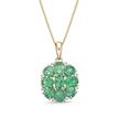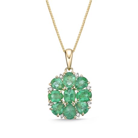 Radiating timeless elegance, this women's pendant features vivid green oval and pear-shaped emeralds set in warm 10K yellow gold. Accented with a sparkling 0.06 carat diamond, it hangs gracefully from an 18-inch box chain with a secure spring ring clasp. A captivating blend of color and shine, this pendant adds a touch of luxury to any look—making it the perfect statement of sophisticated charm.