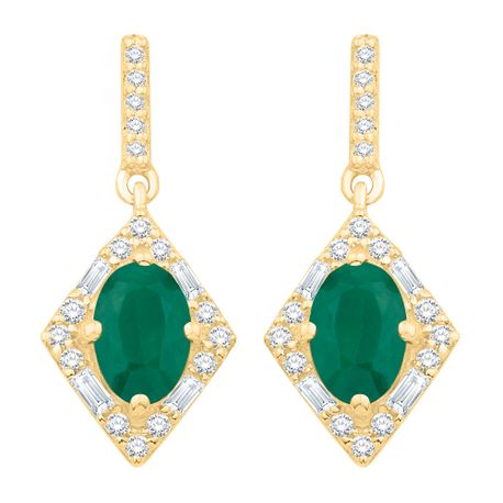 Gemminded 10K Yellow Gold 6x4 mm Oval Cut Genuine Emerald Dangeling Earring with 0.27 Carat Diamond Accent - Friction Back
