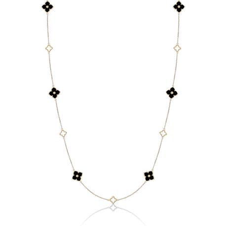 Elevate your elegance with this captivating women’s necklace featuring 11 striking black onyx flower stations set in radiant yellow gold plated 925 sterling silver. Sparkling cubic zirconia accents add a touch of brilliance, while the 32-inch adjustable cable chain ensures versatile styling. A secure lobster claw clasp completes this bold yet feminine look—perfect for day-to-night sophistication with a mysterious edge.