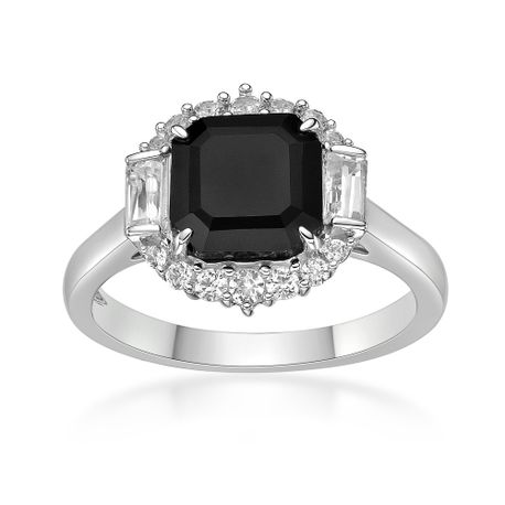 Gemminded 925 Sterling Silver 8 mm Asscher Cut Black Onyx Ring with Created White Sapphire Halo