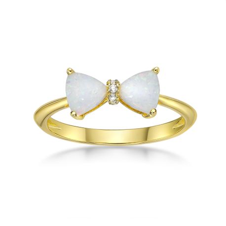 Gemminded Created Opal Trillion Cut 925 Yellow Sterling Silver Bow Ring with Round White Diamond Accent