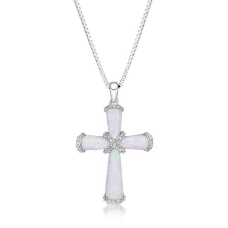 Gemminded Created White Opal Cross Pendant with .07 cttw Diamonds - Sterling Silver - 18 Inch