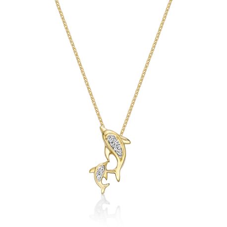 Dive into a world of elegance with our stunning 10K Yellow Gold Mini Mother and Child Dolphin Pendant. This exquisite piece features sparkling 0.02 Round Diamonds, symbolizing the everlasting bond between mother and child. Paired with an 18-inch cable chain, this pendant is the perfect gift for any strong and loving woman. With a classic spring ring closure, this pendant is a timeless addition to any jewelry collection. Brighten her day with this beautiful symbol of love and family.