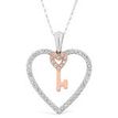 Unlock elegance with this women’s heart and mini key pendant, crafted in radiant 10K white gold. Sparkling with 0.25 ct. round diamonds, its two-tone design exudes timeless charm. The 18" elongated box chain adds refined sophistication, secured with a classic spring ring clasp. A perfect symbol of love and grace, this dazzling piece captures hearts and imaginations alike.