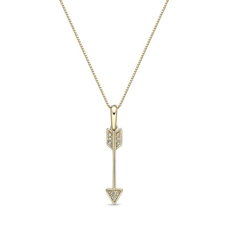 Make a bold style statement with this stunning women's arrow pendant, crafted in radiant 10K yellow gold. Accented with shimmering white round diamonds, it symbolizes strength and direction. Suspended from an 18-inch sleek box chain with a secure spring ring clasp, this elegant piece adds brilliant sparkle and meaning to any look—perfect for everyday wear or special occasions. Let your inner light shine with this powerful, polished design.