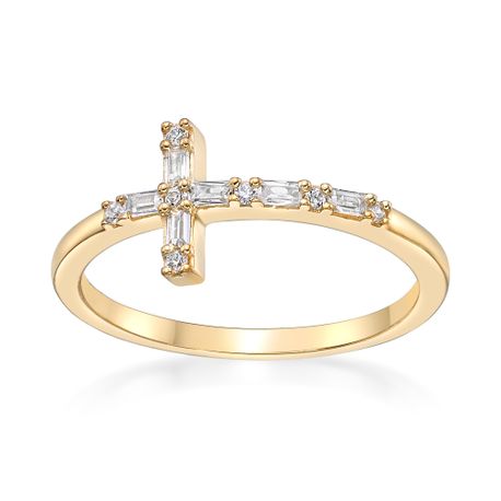 Gemminded White Diamond Baguette Sideways Cross 925 Yellow Sterling Silver Ring