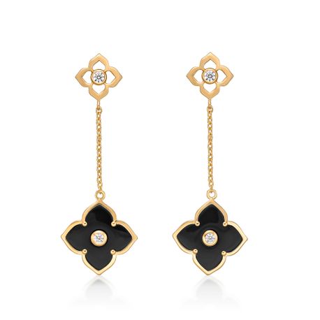 Add a touch of elegance to your jewelry collection with our Black Onyx Double Flower Dangle Drop Earrings. Made from high-quality 925 sterling silver, these earrings feature a stunning black onyx gemstone. The black color adds a touch of mystique, making these earrings perfect for both casual and formal occasions. With their unique double flower design and yellow gold plating, they are sure to make a statement.