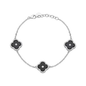 Black Onyx Three-Station Flower Bracelet in 925 Sterling Silver with Cubic Zirconia Halo - 7-8 Inch Adjustable Cable Chain