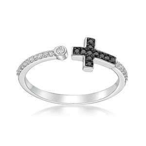 Black Diamond Bypass Cross 925 Sterling Silver Ring with White Diamond Semi-Eternity Accent