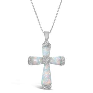 Created White Opal Cross Pendant with .07 cttw Diamonds - Sterling Silver - 18 Inch